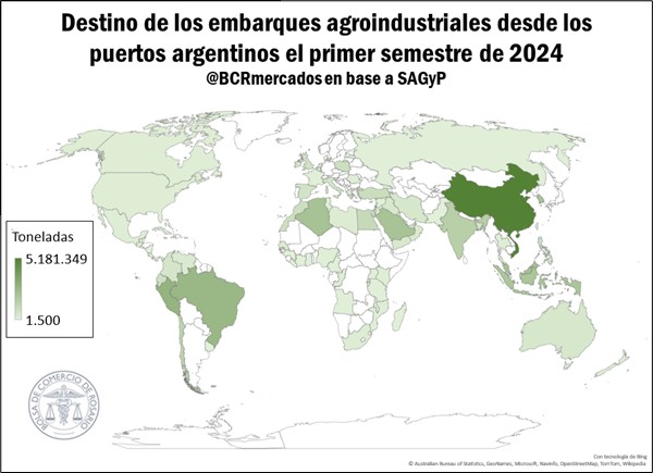 Observando el interior de cada una de las categorías, China se destaca como el principal receptor de embarques argentinos de granos. En el primer semestre del año, los volúmenes despachados al país asiático totalizaron 4,9 Mt, representando el 19% del volumen total. Esta cifra muestra un incremento del 120% con respecto a igual período de 2023, cuando los envíos de granos ascendieron a 2,2 Mt, y un aumento del 73% en relación con el promedio.