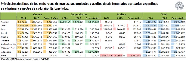 Desagregando la información por países, Vietnam aparece como el principal destino de los envíos totales que se hicieron entre enero y junio del año en curso, alcanzando un volumen de 5,2 Mt de embarques de granos, subproductos y aceites. Este guarismo representa un incremento del 121% respecto de los embarques a este país en igual período de 2023, y del 33% respecto al promedio de los últimos tres años. El segundo principal destino de nuestros embarques fue China, hacia donde también se enviaron 5,2 Mt de productos agroindustriales en los primeros seis meses del año, esto es, 122% más que el año anterior y 73% por encima del promedio de envíos de los últimos tres años. En tercer lugar, se destaca Perú, con un volumen de despachos de 2,8 Mt de enero a junio, un ascenso del 48% respecto al año previo y del 43% con respecto al promedio de los últimos tres años.