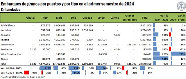 Los embarques de sorgo y cebada evidenciaron un crecimiento del 186% y 30% interanual, respectivamente, lo que advierte un aumento de 541.000 y 535.000 toneladas en volumen. Con respecto al girasol, mientras en el primer semestre de 2023 no se registraron despachos de la oleaginosa, este año se embarcaron aproximadamente 3.100 toneladas. Finalmente, los despachos de canola avanzaron un 11% respecto de los primeros seis meses de 2023, aunque en términos de volumen el incremento es de apenas 980 toneladas.