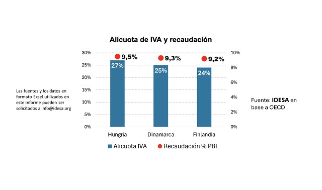 Dinamarca que con una alícuota general del 25% recauda 9,3% del PBI.