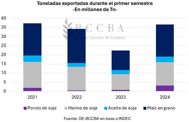 Hasta junio, se han exportado aproximadamente 36,5 millones de toneladas, sumando las toneladas comercializadas por el complejo sojero (porotos, aceite y harina) y el maíz en grano. Dicho volumen, representa un incremento del 65% respecto los primeros seis meses del 2023, superando además, los 34 millones de toneladas exportadas durante el primer semestre del 2022, periodo en el cual se produjo el mayor ingreso de divisas durante el primer semestre de los últimos cuatro años.