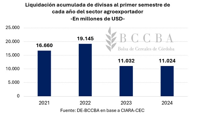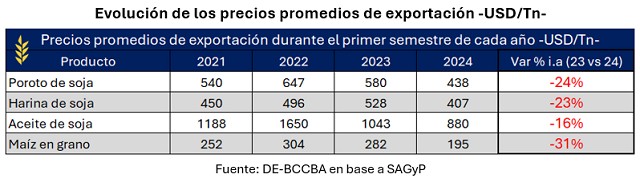 Además, la exportación de productos del complejo sojero y de maíz, se ha incrementado un 65% respecto el primer semestre del 2023. Pero, como consecuencia de menores precios, el ingreso de divisas durante el primer semestre fue el más bajo de los últimos cuatro años.
