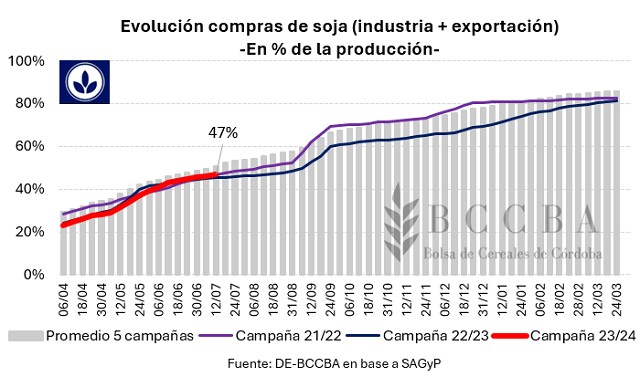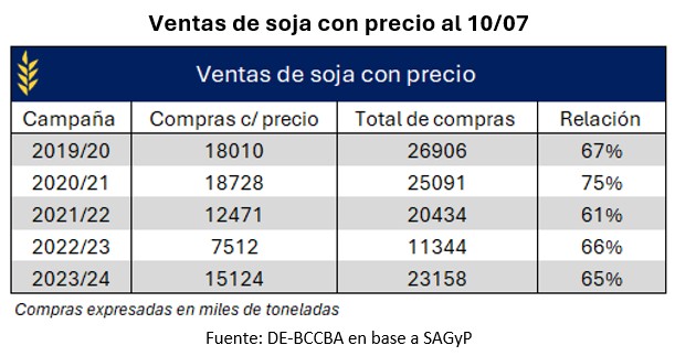 La producción de soja a nivel nacional para la campaña 2023/24 se ubicaría alrededor de los 49 millones de toneladas de acuerdo con la estimación de la Secretaría de Agricultura, Ganadería y Pesca de la Nación. A la segunda semana de julio, se han vendido 23 millones de toneladas, lo cual representa el 47% de la producción estimada. Este ritmo en la comercialización se posiciona dos puntos porcentuales por encima del ciclo previo y tres por debajo del promedio de las últimas cinco campañas.