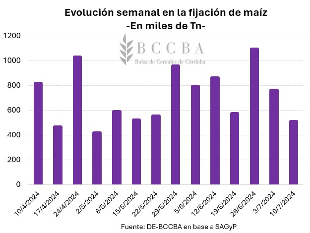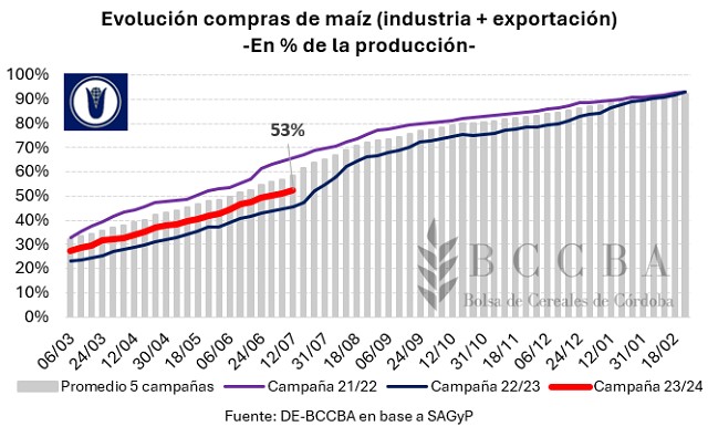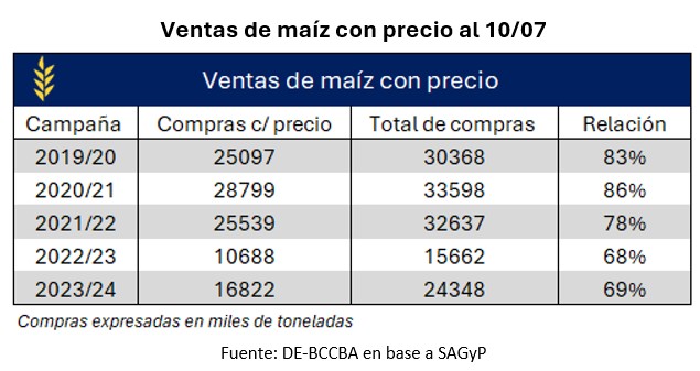 Al 10 de julio se encuentran comercializadas alrededor de 24,5 millones de toneladas. Según la Bolsa de Comercio de Rosario, la producción de maíz a nivel nacional alcanzaría los 47,5 millones de toneladas, por lo cual, el volumen vendido representaría el 53% de la producción. El avance actual, se posiciona siete puntos porcentuales por encima de la campaña previa y cinco puntos porcentuales por debajo del promedio de las últimas cinco.