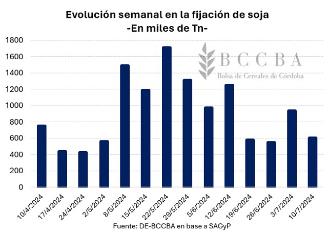 Por otra parte, fue durante el mes de mayo donde se observaron la mayor cantidad de fijaciones, mes en el cual la brecha cambiaria promedió el 25%, mientras que en el mes de junio el promedio trepó al 40%. Consecuentemente, el precio disponible de la soja ajustado en dólares, en promedio, disminuyó USD 23 Tn al pasar de un mes a otro.