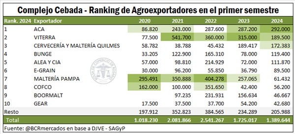 El 57% de las ventas registradas en el primer semestre 2024 corresponden a cebada forrajera, un 38% a cebada cervecera y el restante 5% a malta. El liderazgo de ventas registradas de cebada forrajera corresponde a ACA con 237 mil toneladas, mientras que Cervecería y Maltería Quilmes ocupa el primer puesto de ventas de cebada cervecera con 160 mil toneladas. En el caso de la malta BOORTMALT registró la mayor cantidad de ventas con 46,66 mil toneladas.