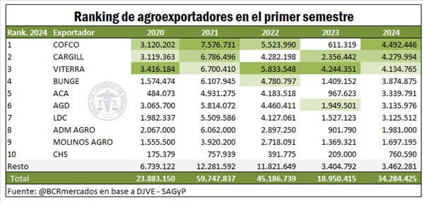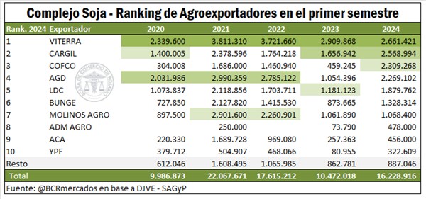 En el primer semestre de 2024 el complejo soja se declararon 16,23 Mt, un 55% más que el primer semestre del año 2023. Las ventas al exterior durante este período fueron lideradas por la empresa Viterra, manteniendo el primer puesto durante 5 años consecutivos.