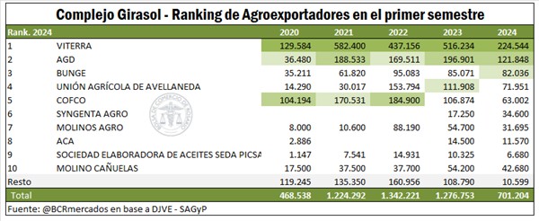 El 53% de las ventas registradas en el primer semestre 2024 del complejo corresponden a subproductos de girasol, un 43% corresponde al aceite, 2% a semilla de girasol y el restante 2% a girasol confitero. El ranking de ventas de subproductos y aceite es liderado por Viterra con 115,1 mil toneladas y 109,44 toneladas respectivamente. En cuanto a semillas de girasol la mayor cantidad de ventas las registra la empresa PETROAGRO con 3.680 toneladas, y en el caso del girasol confitero PEREDA AGRO con 3.588 toneladas.