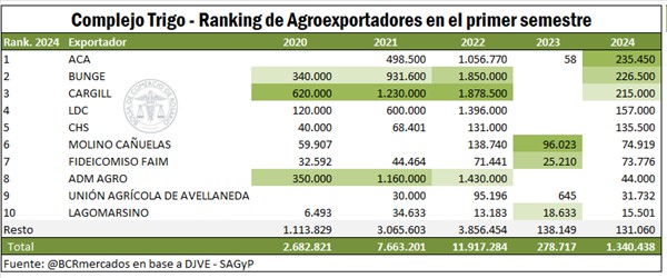 En el primer semestre de 2024 el complejo maíz se declararon 1,34 Mt, un 381% más que el primer semestre del año 2023, sin embargo, se coloca como el segundo primer semestre más bajo de los últimos 5 años. Las ventas al exterior del complejo trigo durante este período fueron lideradas por la empresa ACA (Asociación de Cooperativas Argentinas) con 235 mil toneladas.