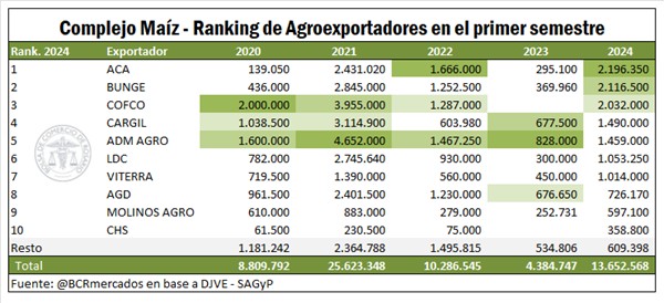En el primer semestre de 2024 el complejo maíz se declararon 13,65 Mt, un 211% más que el primer semestre del año 2023, siendo el segundo volumen más alto de registraciones si se consideran los últimos 5 años. Las ventas al exterior durante este período fueron lideradas por la empresa ACA (Asociación de Cooperativas Argentinas).