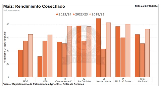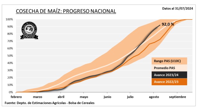 La cosecha de maíz comienza su recta final, luego de haberse cosechado el 92% del total estimado reportando un rinde medio nacional de 64,8 qq/Ha. Mantenemos nuestra proyección de producción en 46,5 MTn.
