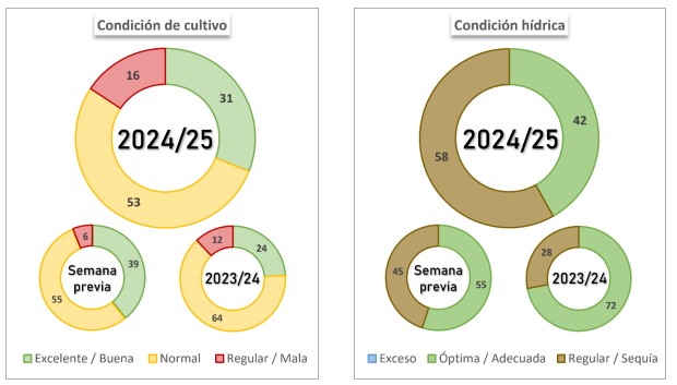 Se da por finalizada la siembra con un área estimada en 6,3 MHa. La condición hídrica cae 12,3 p.p. intersemanalmente por la falta de lluvias y el aumento de la demanda del cultivo que transita macollaje-encañazón en el 39,9 % del área.