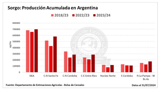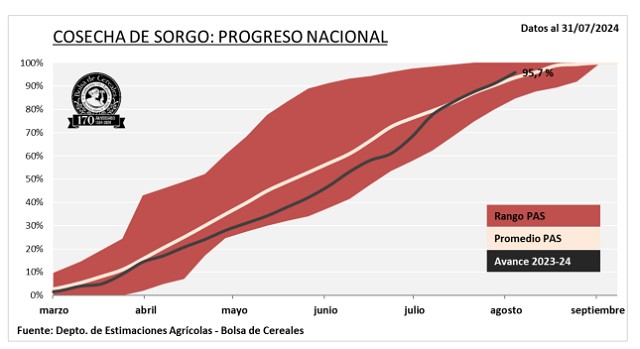 La cosecha de sorgo granífero, al igual que maíz, transita la etapa final con el 95,7% de los lotes ya cosechados. Solo resta superficie por recolectar en el sur del área agrícola. Mantenemos nuestra proyección de producción en 3 MTn.