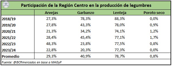Cabe destacar, además, la importante participación de la Región Centro en la producción total de legumbres. En conjunto, las provincias de Córdoba, Santa Fe y Entre Ríos explicaron de las últimas 6 campañas, en promedio, el 80% de la producción de lentejas, el 45% de la de garbanzo y el 30% de arvejas, mientras que su participación en la producción de porotos es marginal.