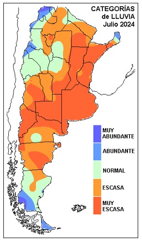 La escasez de precipitaciones que prevaleció del mes de junio se perfilaba muy difícil de revertir desde el momento en que las primeras jornadas del mes pasado comenzaron a mostrar un enfriamiento persistente y riguroso. Normalmente el mes de julio es el mes en que la actividad atmosférica alcanza un mínimo. Esto está ligado a que las áreas continentales se encuentran en su momento de mayor enfriamiento, lo cual redunda en fuerte factor de estabilidad, con inhibición de los movimientos verticales. Si bien las temperaturas se fueron recuperando a medida que transcurrió la segunda quincena del mes, esto no logró romper la inercia del comportamiento de gran escala y solo se observaron algunas excepciones zonales en el norte de la Mesopotamia y en algunas zonas de ER.
