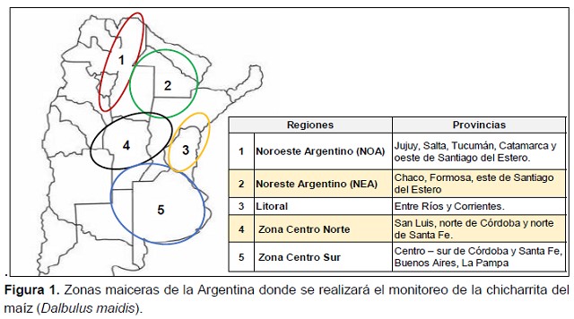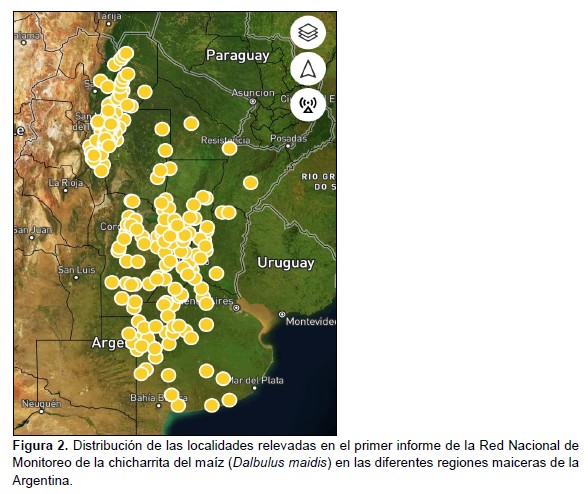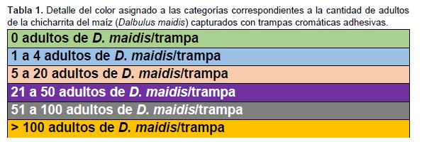 Los objetivos perseguidos con la Red Nacional de monitoreo son: a) Informar sobre la captura con trampas cromáticas adhesivas de los adultos de D. maidis en diferentes regiones productoras del cultivo de maíz en Argentina (Figura 1) y b) Informar sobre el porcentaje de la infección estacional de los adultos de D. maidis a Corn Stunt Spiroplasma (CSS), que estará a cargo del Centro de Bioinvestigaciones de la UNNOBA - CICBA (CONICET).