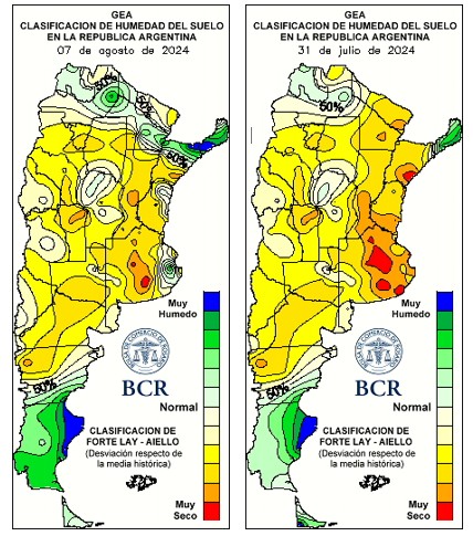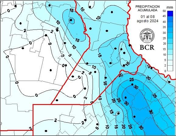 Rojas, Chacabuco y Pergamino terminaron la 1ra semana de agosto con 34, 32 y 31mm, respectivamente. El NE bonaerense fue la zona más beneficiada por estas lluvias que fueron una “yapa” para la región: superaron en cobertura y acumulados a los pronósticos más optimistas. En el SE santafesino los acumulados estuvieron entre los 10 y 20 mm. Por otro lado, en el oeste de la región hay localidades sin registros, como Canals, Idiazabal, Colonia Almada o Bengolea, en Córdoba.