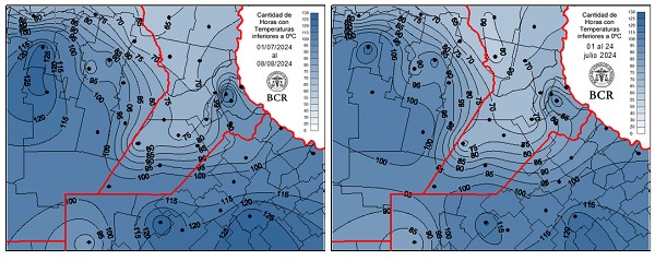 Las expectativas de siembra de maíz no cambiaron tras las recientes lluvias. La intención de siembra en la zona núcleo sigue marcando un 30% menos de área (respecto al año pasado) y las compras de insumos siguen estancadas. La precampaña espera una mejora en el precio internacional o mejores lluvias en agosto y setiembre. Tambien hay otro factor crítico: la evolución de la chicharrita tras los fuertes fríos de julio y agosto. La actualización del mapa de horas acumuladas con temperaturas por debajo del cero muestra que hubo un incremento de 5 a 10 horas bajo esas condiciones en los últimos 15 días. En el oeste, aún más.