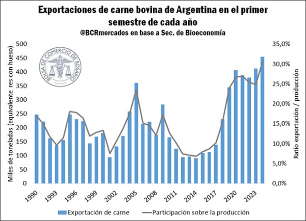 A la vez que las exportaciones aumentan, la producción disminuye un 10% interanual, luego del récord productivo del año 2023, el cual estuvo apuntalado por la necesidad de enviar animales a faena en un contexto de escasez de pasturas y agua generado por la sequía. Esta conjunción de factores genera que las exportaciones del primer semestre del año en curso representen un 30,6% de la producción total. Este guarismo constituye un récord en los registros y se encuentra cinco puntos porcentuales por encima del promedio de los últimos cinco años para el mismo período, que es de 25,6%.