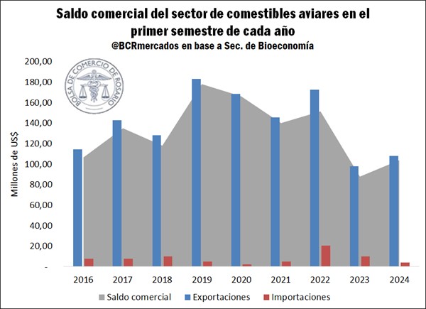 Los productos alimenticios que derivan de la faena avícola local y que luego son exportados al resto del mundo históricamente superaron a las importaciones. Este sector brinda al comercio internacional año a año aproximadamente el equivalente al 9% de nuestra producción local.