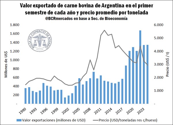 A pesar de que las exportaciones de carne vacuna crecieron un 10% en volumen de forma interanual, por la caída de precios el valor de estas exportaciones se mantuvo prácticamente sin cambios si se lo contabiliza en dólares. En el primer semestre de 2024, ingresaron al país unos US$ 1.346 millones por exportaciones de carne vacuna, sólo un 0,1% por encima del año previo y en línea con el promedio del último lustro. De la serie de datos disponibles, este constituye el segundo mayor registro luego del récord de US$ 1.676 M logrado en el primer semestre de 2022. La caída se explica íntegramente por una disminución de precios: en el primer semestre de 2022 el precio promedio de las exportaciones rondaba los US$ 4.406 por tonelada, mientras que en el año actual el precio promedio retrocedió a los US$ 2.959 /t, es decir, disminuyó un 33% en los últimos dos años.