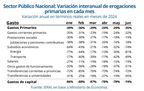 Los mayores ajustes anuales en el gasto del primer semestre se dieron en las transferencias a provincias (-98% las de capital y -74% las corrientes), en la inversión pública (-71%), en los subsidios económicos (-43%) y en las jubilaciones (-27%).