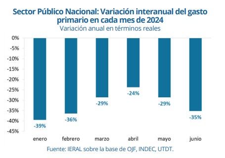 El ajuste del gasto primario fue del 39% anual en enero, para luego desacelerar la caída hasta el mes de abril, cuando la reducción resultó del 24% anual. A partir de mayo el ajuste vuelve a acelerar, y termina el semestre con una caída del 35% en junio. Ahora bien, ¿en qué tipo de erogaciones se aceleró o desaceleró el ajuste en los últimos meses del primer semestre?