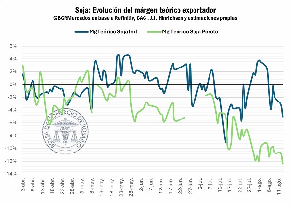 Así las fuertes caídas en las cotizaciones FOB puertos argentinos de poroto de soja y derivados han llevado a un resentimiento significativo en el margen exportador, operando con grandes pérdidas dada la dinámica comercial interna.