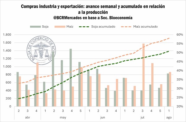 Los primeros días de agosto mantuvieron la tendencia exportadora, aunque la parálisis de la actividad portuaria de los últimos días frenó fuertemente el embarque del conjunto de productos. Se logra vislumbrar cómo el foco de la exportación se encuentra en el maíz, intensificando la búsqueda de mercadería por parte del sector exportador sobre el mercado interno.