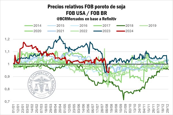 En este sentido, en términos relativos, el precio FOB por soja embarcada sobre el Golfo de México con relación a su par carioca ha estado por debajo de los niveles actuales en seis de los últimos diez años. Por lo tanto, dada la coyuntura actual con violentos reordenamientos de precios relativos, y la fugaz mudanza de las compras chinas hacia el hemisferio sur, existen posibilidades de un mayor ajuste vía precios.