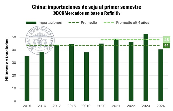 En este contexto, China mantiene el foco de su demanda en Sudamérica, pero ya estamos en momentos donde se tendría que dar la transición de compras desde esta región hacia América del Norte, debido al próximo ingreso de la nueva cosecha. No obstante, se siente la menor demanda de soja de dicho país. En el primer semestre de 2024, las importaciones de soja de China caen 9% con relación al primer semestre del 2023, ascendiendo a 48 Mt, principalmente provenientes desde Brasil y quitándole participación a Estados Unidos.