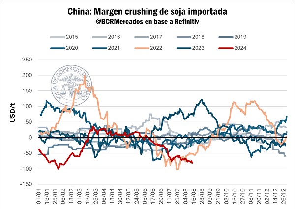 Las caídas en las cotizaciones han cooptado el margen industrial por molienda de soja en las fábricas chinas. Según JC Intelligence a través de Refinitiv, actualmente todas las terminales productivas estarían moliendo a contra margen, quedando así el margen promedio de soja importada tan negativo como durante el año 2022.