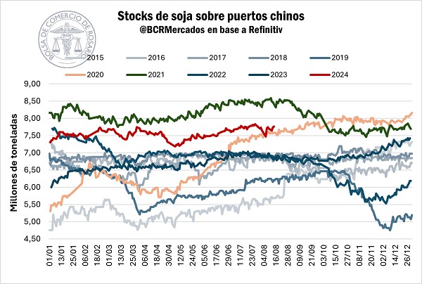 Es que, además de la caída en la demanda, el gigante asiático cuenta con elevados niveles de stocks de porotos de soja en los principales puertos; en total, han mantenido diariamente entre 7 y 7,7 millones de toneladas de soja en lo que va del 2024. Estos guarismos, de no ser por el año 2021, serían los más elevados en por lo menos una década.