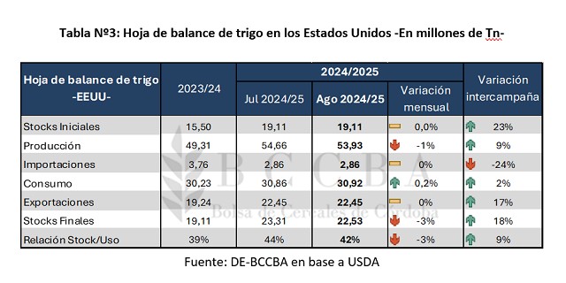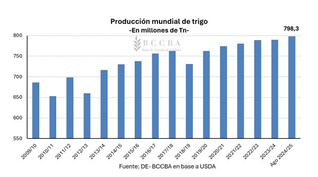 El Departamento de Agricultura de los Estados Unidos en su reporte de agosto, mantiene su proyección para Argentina sin modificaciones en 18 millones de toneladas, sin embargo, a partir de este momento comienza la etapa crítica para definir los rendimientos futuros del cereal. A nivel local, según la Secretaría de Agricultura, Ganadería y Pesca (SAGyP), ya se encuentran sembradas en su totalidad las 6,3 millones de hectáreas destinadas al trigo. Mientras que, la Bolsa de Comercio de Rosario por su parte, estima 6,7 millones de hectáreas sembradas.