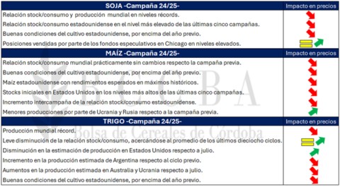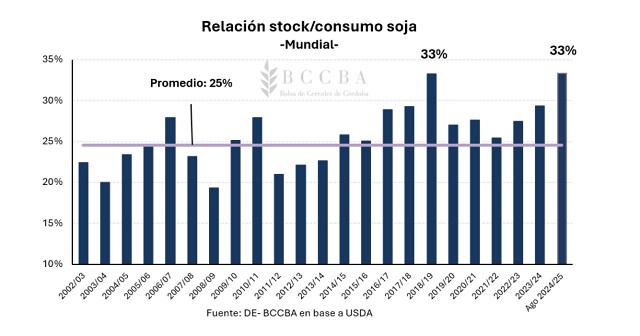 Esta nueva campaña se caracterizaría por elevados stocks iniciales y una buena producción estimada, acompañados por incrementos en menor proporción de las exportaciones y el consumo, dejando un saldo aproximado de 53 millones de toneladas en concepto de stocks finales para el ciclo 2024/25. Este volumen, implicaría un aumento del 11% respecto al ciclo previo, por lo que la relación stock/consumo se incrementaría un 10% y se ubicaría como el valor más elevado (14%) de las últimas seis campañas.