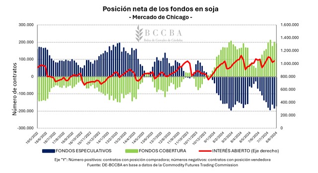 La cotización del trigo en Chicago en lo que va de agosto se ubica en USD 198 Tn, un 12% por debajo de agosto del 2023, el cual se posicionaba en USD 226 Tn. En cuanto a los fondos especulativos mantienen sus posiciones vendidas en niveles constantes desde finales de junio.