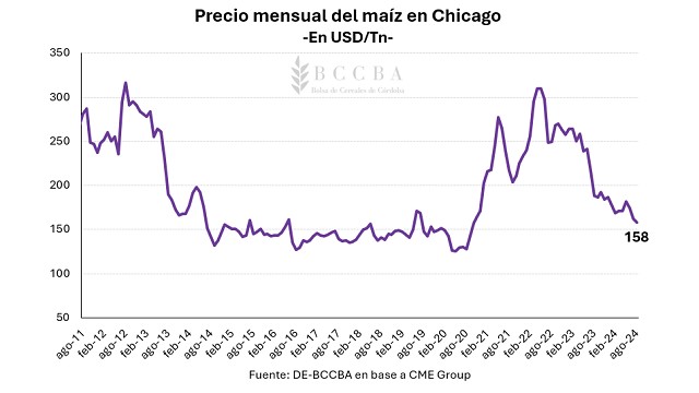 En lo que va de agosto, el precio mensual se ubica en torno a los USD 158 Tn. Desde enero, el precio del cereal ha caído USD 20 Tn. En cambio, si la comparación se realiza respecto de los máximos observados en abril del 2022, la caída supera los USD 150 Tn.
