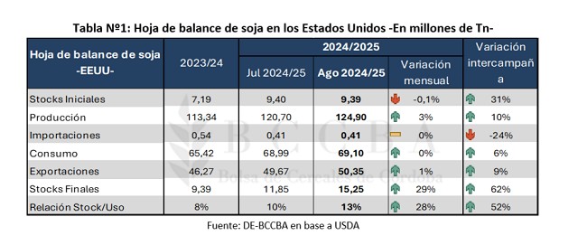 El Departamento de Agricultura de Estados Unidos (USDA) en su informe correspondiente al mes de agosto, ha realizado cambios en la hoja de balance a nivel mundial para la soja. Para la nueva campaña 2024/25 estimó, nuevamente, un volumen récord en la producción mundial de 429 millones de toneladas, en mayor parte explicado por el incremento en la producción norteamericana de la oleaginosa. Además, con respecto al ciclo pasado, se proyectan incrementos en el consumo del 5% y, de los stocks finales en 20%, generando un exceso de existencias que daría como resultado una relación stock/consumo del 33%, igualando el récord alcanzado en la campaña 2018/19.