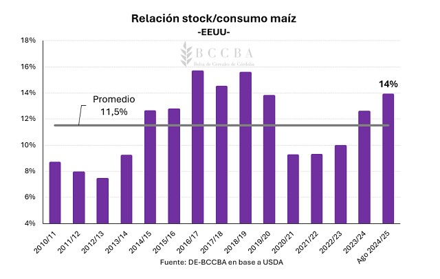 De acuerdo con el USDA, durante el ciclo 2023/24 la producción de maíz estadounidense habría alcanzado la cifra récord de 399 millones de toneladas. Por lo cual, los stocks iniciales para la campaña 2024/25 serían de 47 millones de toneladas, el valor más alto de los últimos cinco años.