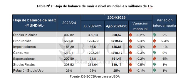 En cuanto a la producción mundial, el USDA incrementó nuevamente su estimación, situándola en 798 millones de toneladas. Este valor se encuentra 2 millones de toneladas por sobre el número publicado en julio, ubicándose como récord. Respecto al mes anterior, la relación stock/consumo disminuyó levemente, ubicándose en un 32%, a causa del incremento en la estimación del consumo (4 millones de toneladas) y una caída en las existencias finales (600 mil toneladas).