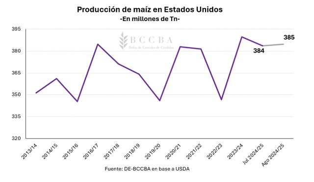 A pesar de que el área de maíz a cosechar para el nuevo ciclo se reduciría en un 4%, la producción estimada se incrementó en 1 millón de toneladas respecto a la estimación de julio y alcanzaría los 385 millones de toneladas. Esto obedece, a que el rendimiento esperado promedio sería histórico y alcanzaría los 115, qq/ha, alcanzando su mayor valor en su historia.