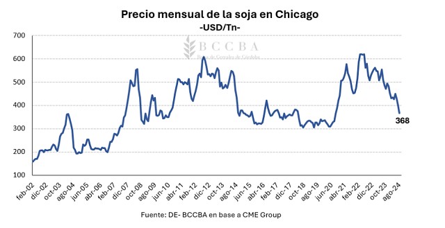 La cotización de la oleaginosa en Chicago continúa su tendencia bajista, donde el precio promedio en lo que va de agosto se posiciona en USD 368 Tn, si se lo compara con el valor observado en agosto del 2023 (USD 510 Tn), la caída interanual asciende al 28%.