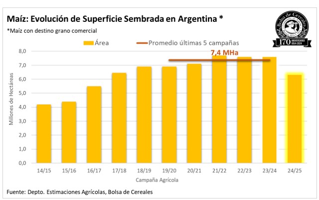 Frente a este panorama, se proyecta una superficie total destinada a maíz con destino grano comercial de 6.300.000 hectáreas, 1,3 MHa menos respecto a la campaña anterior (es decir, un -17,1 %), sujeta a la evolución de las variables económicas y climáticas dada la extensa ventana de siembra y también a la evolución de las poblaciones de Dalbulus maidis. De concretarse, se estarían alcanzando niveles por debajo de la campaña 2017/18.