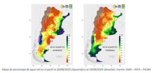 El inicio de la campaña 2024/25 encuentra a los perfiles con condiciones adecuadas de humedad en profundidad para buena parte de la provincia de Buenos Aires, aunque en superficie la humedad es escasa. Para las zonas primicia de siembra de maíz, la humedad tanto en profundidad como en superficie es insuficiente lo que obliga a esperar lluvias que reviertan esta situación para iniciar la siembra y transitar los primeros estadios en buenas condiciones.