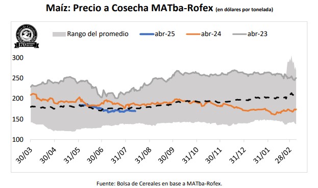 En el plano local, el precio a cosecha del maíz en el mercado de futuros MATba-Rofex para abril de 2025 se sitúa en 171 USD/tn, un 9% por debajo respecto a los valores del año anterior y un 3% por debajo del promedio de las últimas 5 campañas.