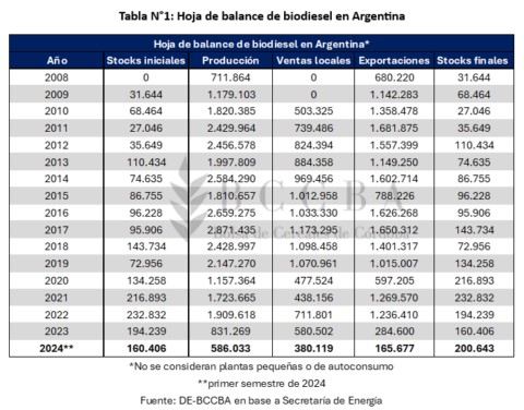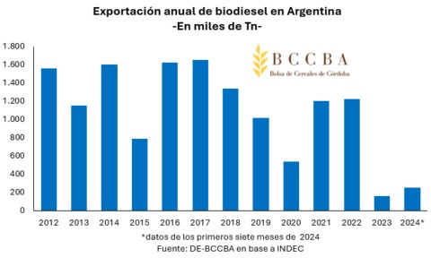 Las menores exportaciones de biodiesel de la historia se presentan en el año 2023, con solo 160 mil toneladas comercializadas, como consecuencia de precios pocos favorables a nivel mundial y una baja producción argentina a causa de una complicada cosecha de soja. En 2024, si bien ya se observa una mejora en las exportaciones de los primeros siete meses, sin embargo, podría posicionarse como el segundo o tercer año con niveles bajos de comercio.