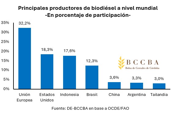 En el mercado mundial del biodiesel, Argentina ocupa el sexto lugar con el 3,3% de participación. Esta industria comienza en el país en el año 2006, luego de haberse establecido un régimen de regulación y promoción para la producción y uso sustentable de los biocombustibles a través de de la Ley Nacional 26.093.
