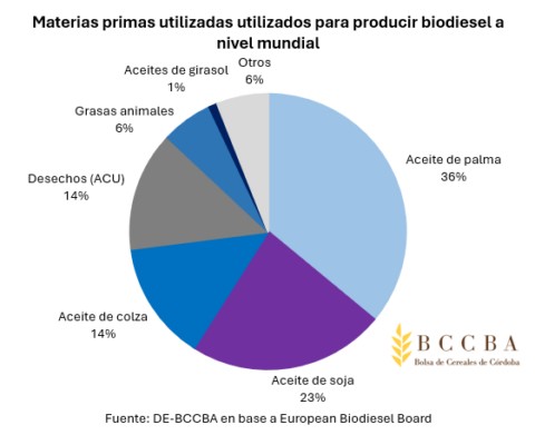 El uso de materias primas para producir biodiesel varía según cada país. Sin embargo, a nivel mundial con el 36% de participación total, se utiliza primordialmente el aceite de palma. El aceite de soja se posiciona como el segundo mayor insumo utilizado, con una participación del 23%. Mientras que, el tercer puesto lo comparten los desechos (sobre todo aceite de cocina usado) y el aceite de colza, que aportan el 14% cada uno. En menor medida, otros factores utilizados son las grasas animales (6%), el aceite de girasol (1%) y otros usos (6%) como puede ser el aceite de coco.