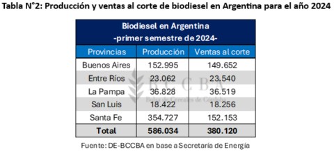 En Argentina, hay 5 provincias que producen y venden biodiesel para el corte con el gasoil y/o diésel. Considerando el primer semestre de 2024, Santa Fe se posiciona como la primera productora, con 354 mil toneladas de biodiesel, le siguió Buenos Aires con 152 mil toneladas generadas y en tercer lugar La Pampa con 36 mil toneladas. Del total producido en el primer semestre, el 65% se destinó para ventas al corte, mientras que, el promedio histórico indica que la relación se establece en un 42%, por lo que el 2024 se posiciona un 23 puntos porcentuales por encima del promedio.