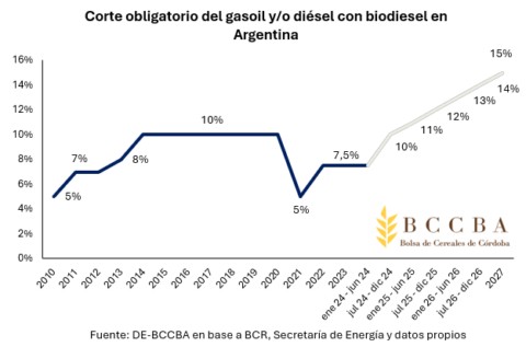 Actualmente, el corte de gasoil y/o diésel con biodiesel se posiciona en un nivel de 7,5%, mostrando una recuperación del año 2023 donde el corte efectivo fue del 5% debido a una menor producción. Con el debate de la nueva Ley de Biocombustibles, que ya se encuentra en el Congreso, se prevén aumentos progresivos. Para la segunda mitad del corriente año, la mezcla debería situarse en un 10% según el esquema previsto. Para los siguientes períodos se plantea un crecimiento de un punto porcentual por año, hasta alcanzar el corte en un 15% en 2027.